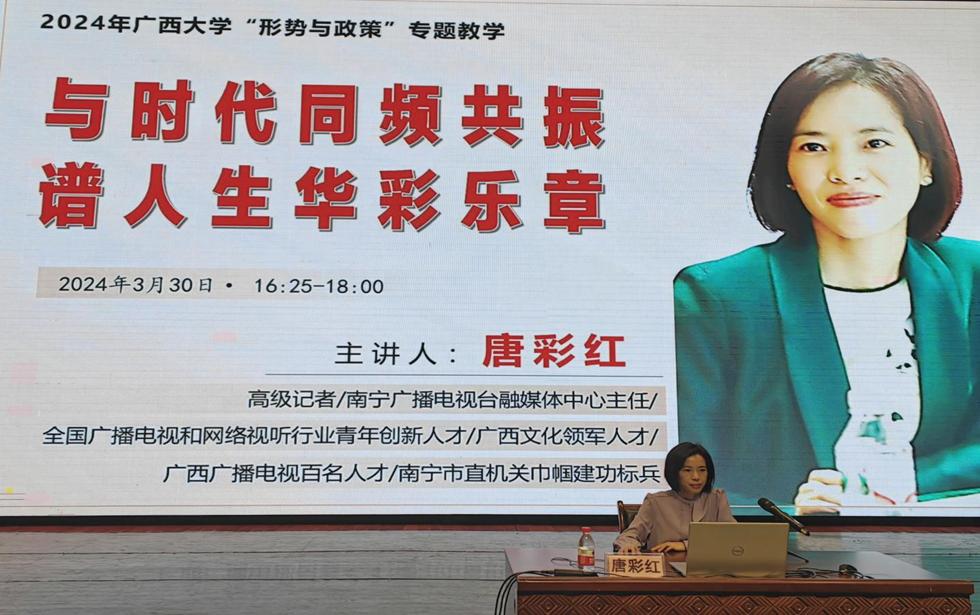 330日,我校在大礼堂举行了“形势与政策”课程专题教学报告会。高级记者、南宁广播电视台融媒体中心主任、南宁市委讲师团特聘专家(教授)唐彩红主任记者为到场师生做了题为“与时代同频共振 谱人生华彩乐章”的报告。